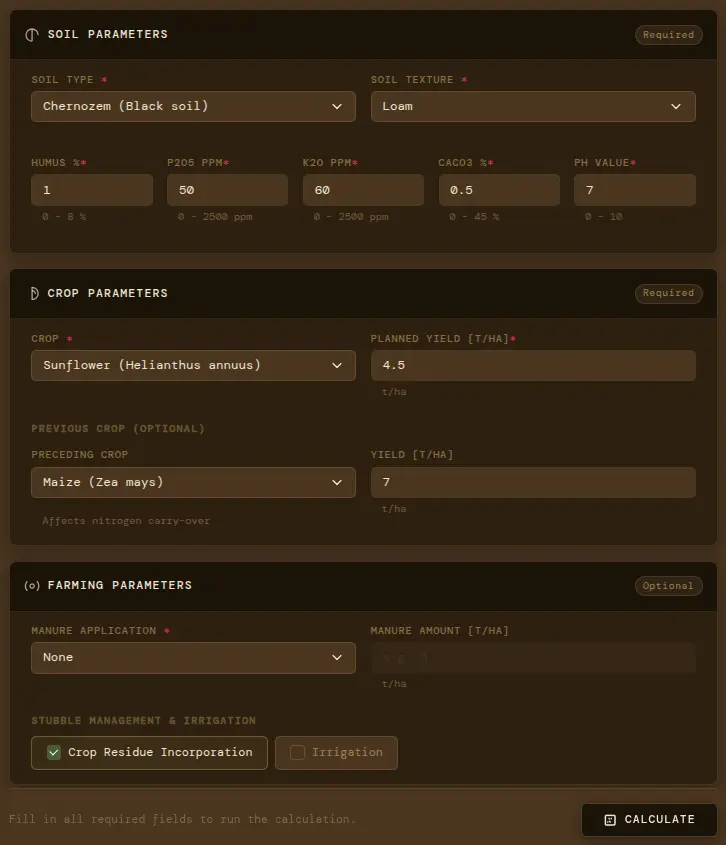 We support a growing list of field crops, including sunflower, maize, and common wheat. Open the calculator to see the full selection.